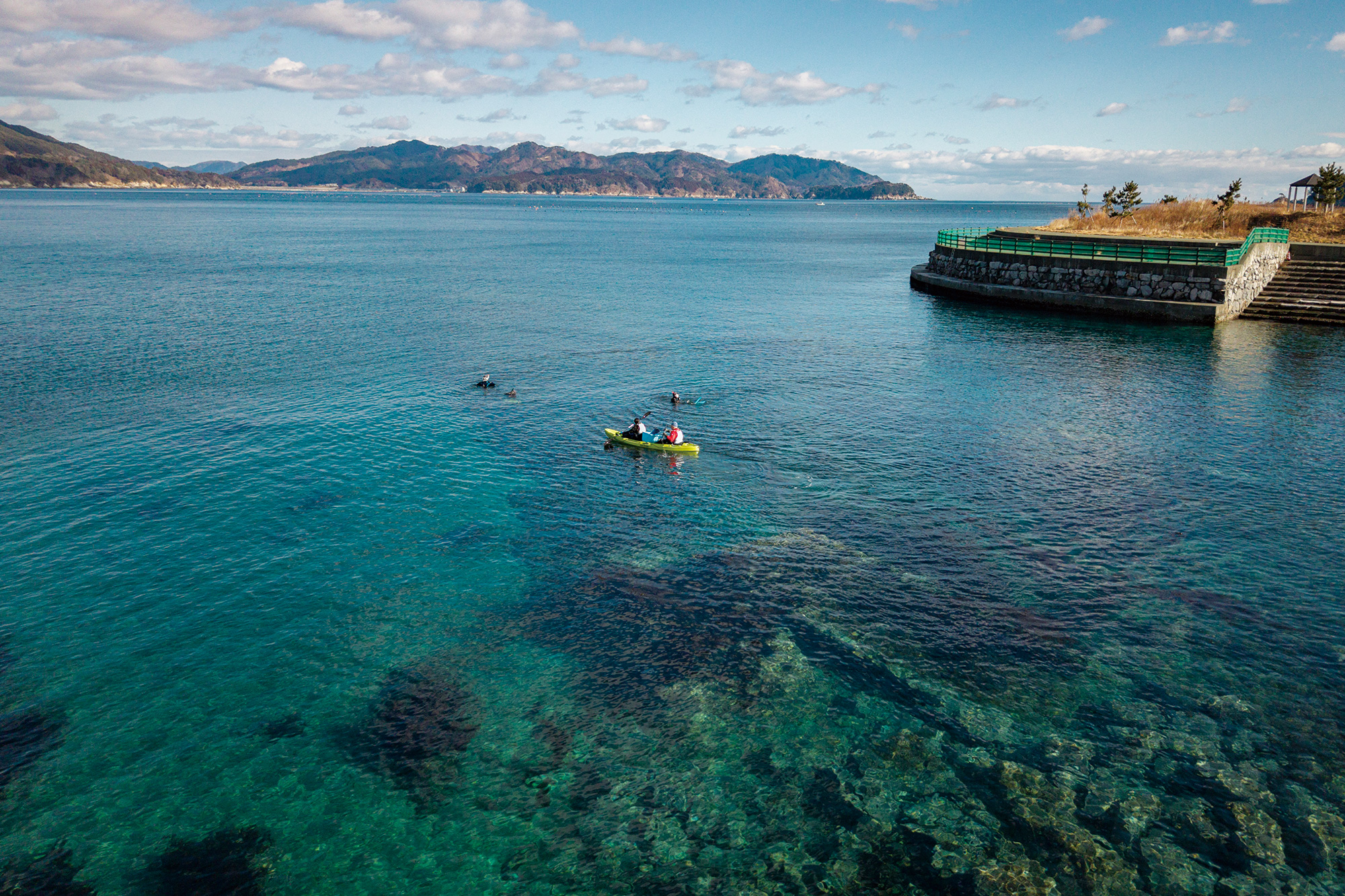 穏やかな海面をカヤックで進みながら、大槌の海をゆっくりと味わいます。水面に近い目線だからこそ、海の色の変化や海底の様子、沿岸の地形を間近に感じることができます。